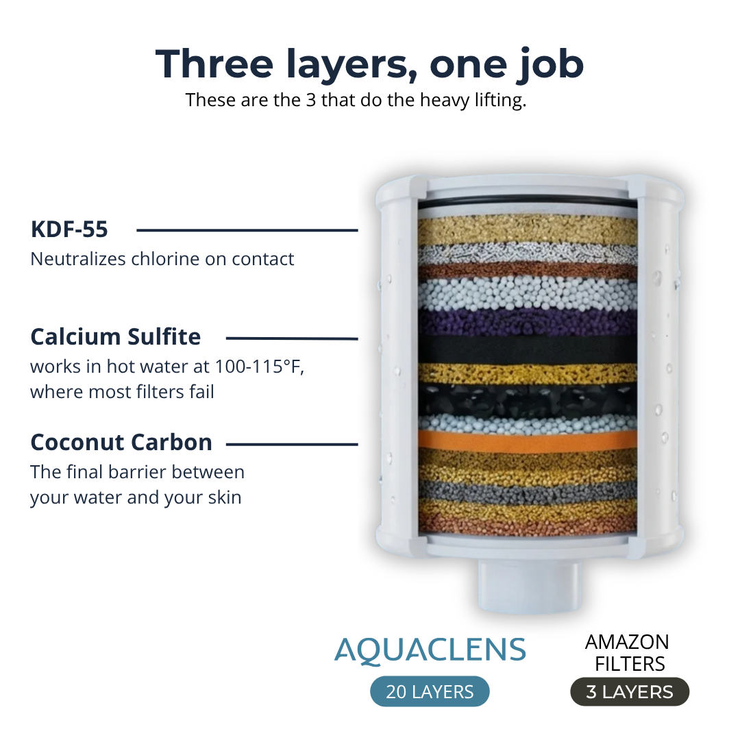 Most $20-40 Amazon showerhead filters use 3 layers of basic activated carbon. Activated carbon loses effectiveness in hot water (your shower runs at 100-115°F). AquaClens uses 20 layers of filtration with three targeted materials that are specifically chosen because they work at real shower temperatures. We also test at real flow rates, not lab conditions. And we back it with a 60-day guarantee, not a 30-day Amazon return window.